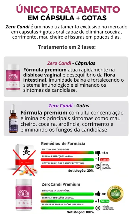 Zero Candi em capsulas que atua direto no tratamento da flora intestinal e vaginal, no qual deve tomar 2 cápsula por dia durante 30 dias.